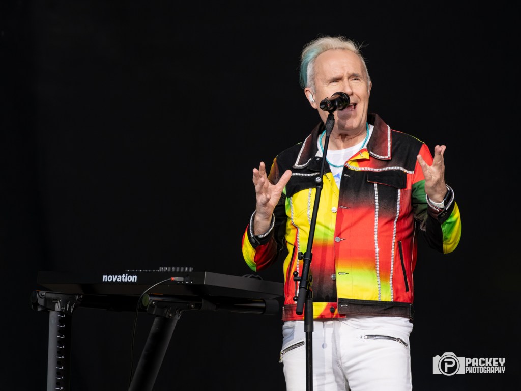 But once I was past my rough patch, it was time for Howard Jones and company to work their magic. Their set included three of my favorite songs: Everlasting Love, No One Is To Blame, and Things Can Only Get Better. Everlasting Love has served as my ear worm since the concert, and I am not complaining. Howard Jones came out in a vividly colored jacket with HoJo written on the back in crystals, and had a blue streak through his hair. The whole stage presence was a combination of black with bright colors in the form of tube lights and the band members’ accessories, such as Dan Clarke’s bold orange glasses and neon yellow drumsticks. The colors brought a playful atmosphere to the already fun music, which meant if you weren’t in the mood to sing and dance, you were definitely in the wrong place.