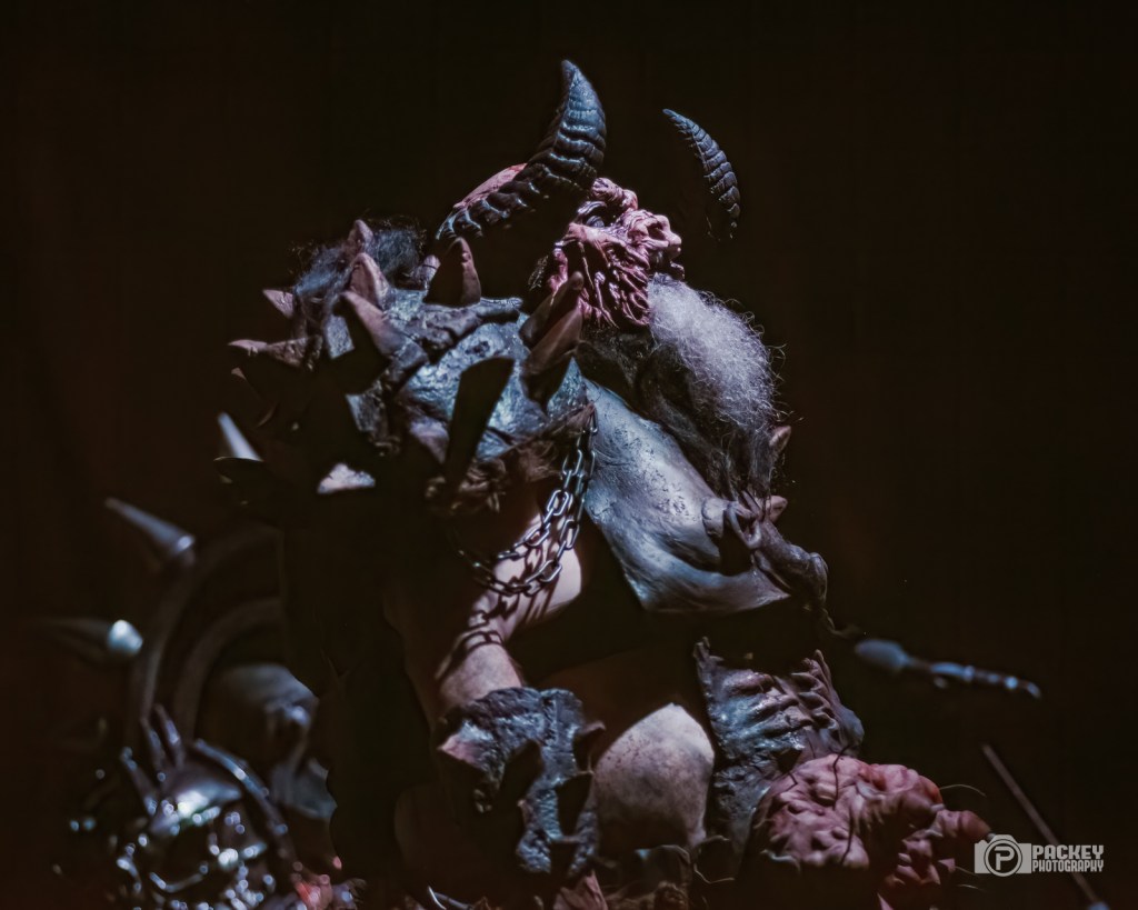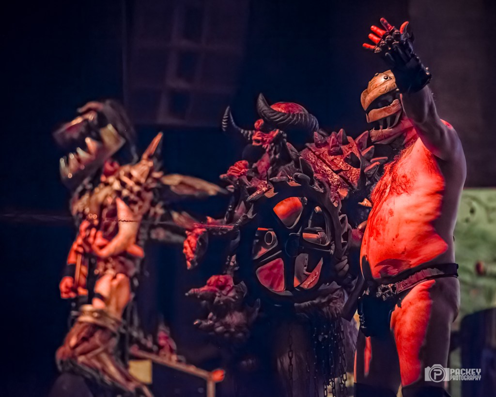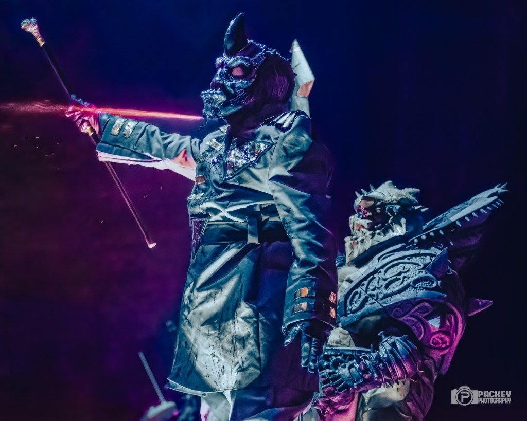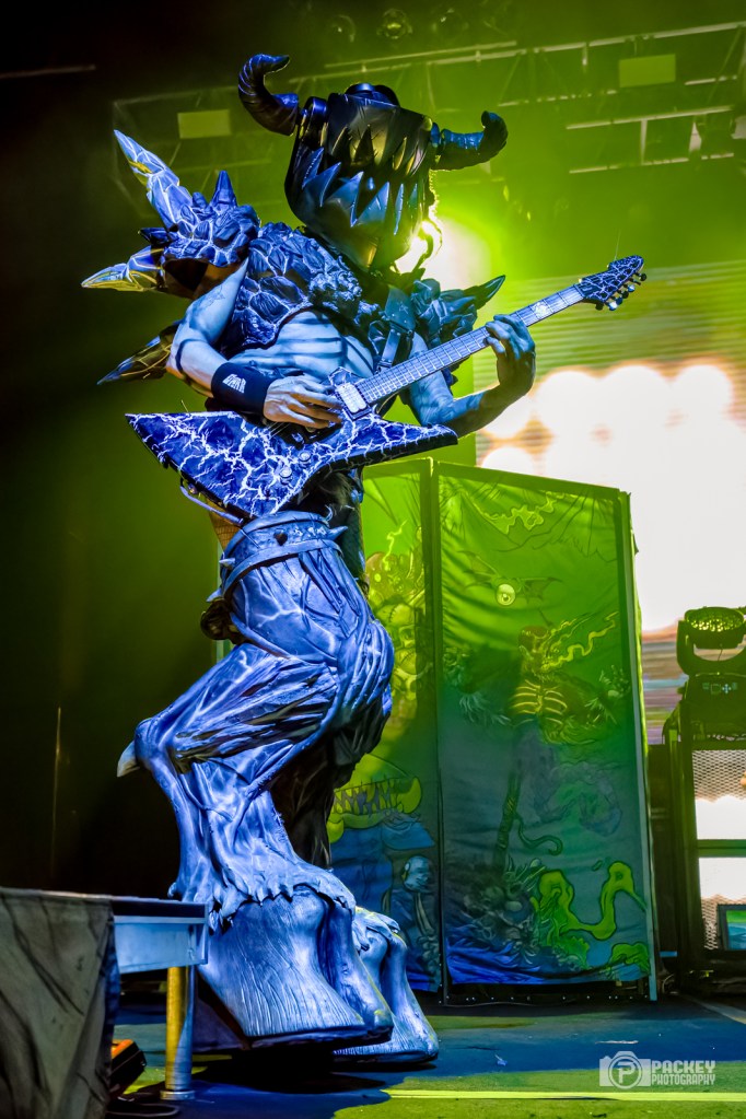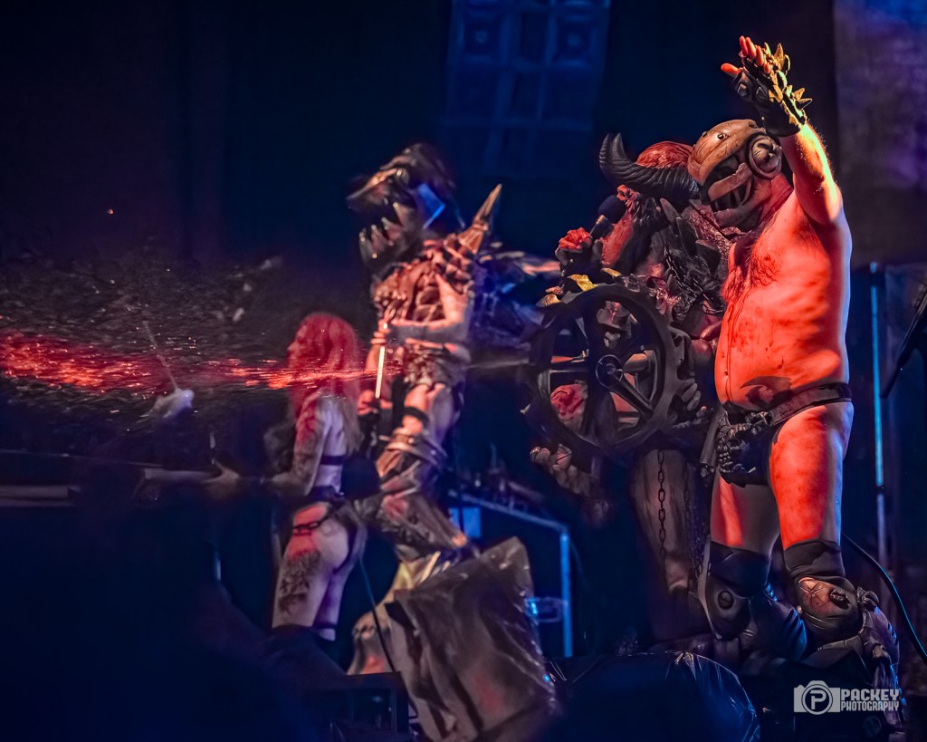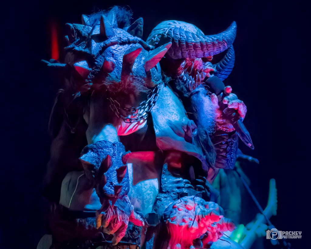 About halfway through the set, singer Blöthar the Berserker called Trump a pedophile, which seemed to piss off a couple of men in the crowd who made their displeasure known… loudly. This surprised me a little bit because what concert did they think they were going to? Gwar have been very clear on their opinions about Trump. But, they didn’t end with Trump. Not in the slightest. The evening encompassed the symbolic deaths portraying caricatures of many important cultural figures, including a priest getting creepy with children, an ICE agent tasering a small child, and Bill Clinton who, upon finding himself in the Epstein files, said, “Dear Epstein Files. I never believed this could happen to me.” Like the others, he was decapitated and his blood soaked the audience, much to their very damp glee.